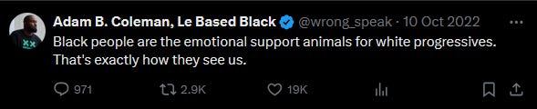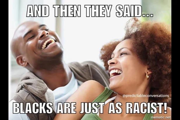 Fundamentally, no white person who goes around calling Black people racist deserves to be taken seriously. But it’s something I’m noticing on Substack a lot since I follow independent and right of center newsletters - many of which are written (and read) primarily by white people. And the relationship these types of white people have to Blacks is underscored by antagonism, disrespect and a sort of moral superiority.